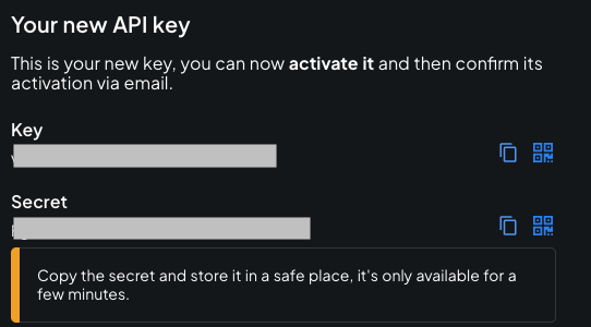 After you click “Activate API Key” you will not be able to recover the Secret!