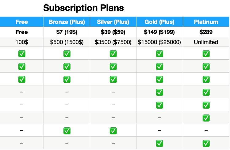 Another difference is Support: Bronze/Silver get best effort support and access to public telegram group where they can contact me. Gold/Platinum get individual support and access to private telegram group where they can contact me.