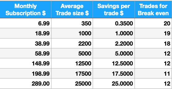 Example: Bronze subscription. Average trade size somewhere between 100 and 500$. Assumption 350$. If you manage to save 10pbs per leg after 20 trades you’ll see break even.
